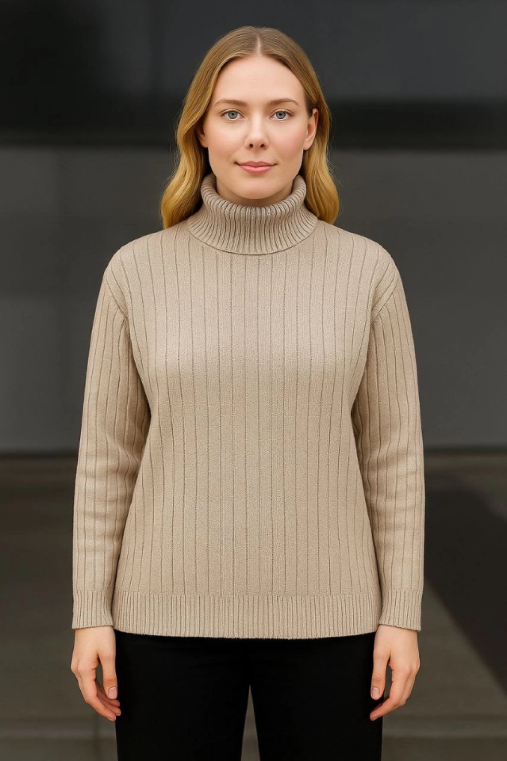 Balıkcı Yaka Bağazlı Triko Kazak Pamuklu Kalın Fitilli Dokuma - Bej