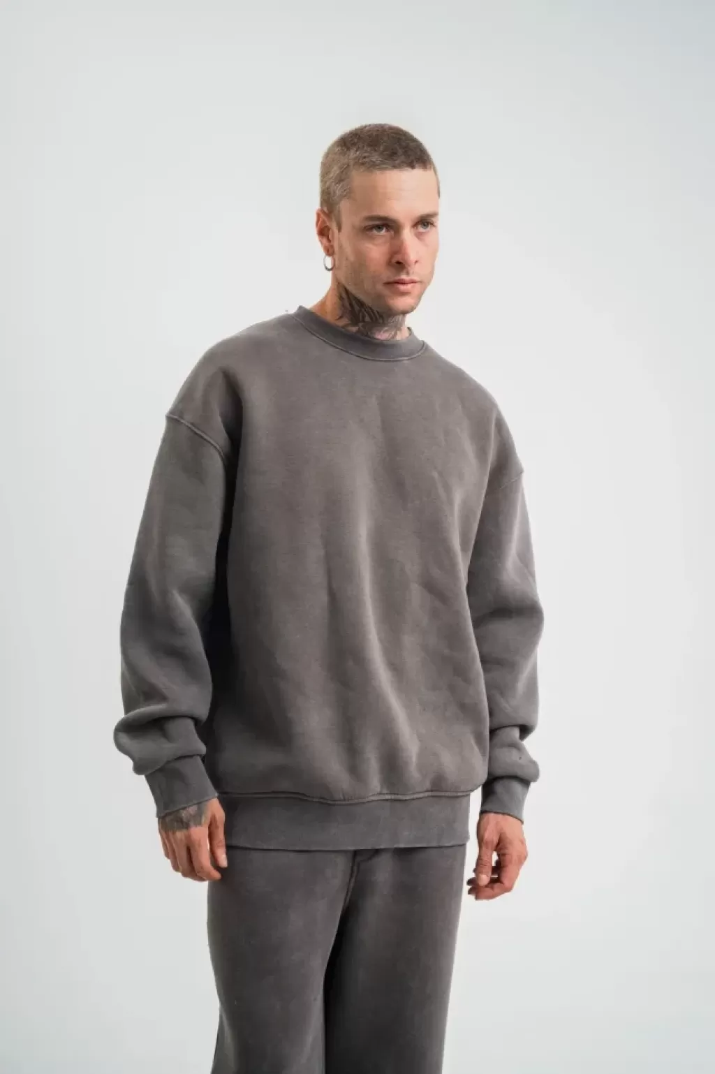 Erkek Patlı Yaka Üç İplik Pamuklu Sweatshirt Double Oversize Rahat Kalıp Günlük Kullanım - Füme