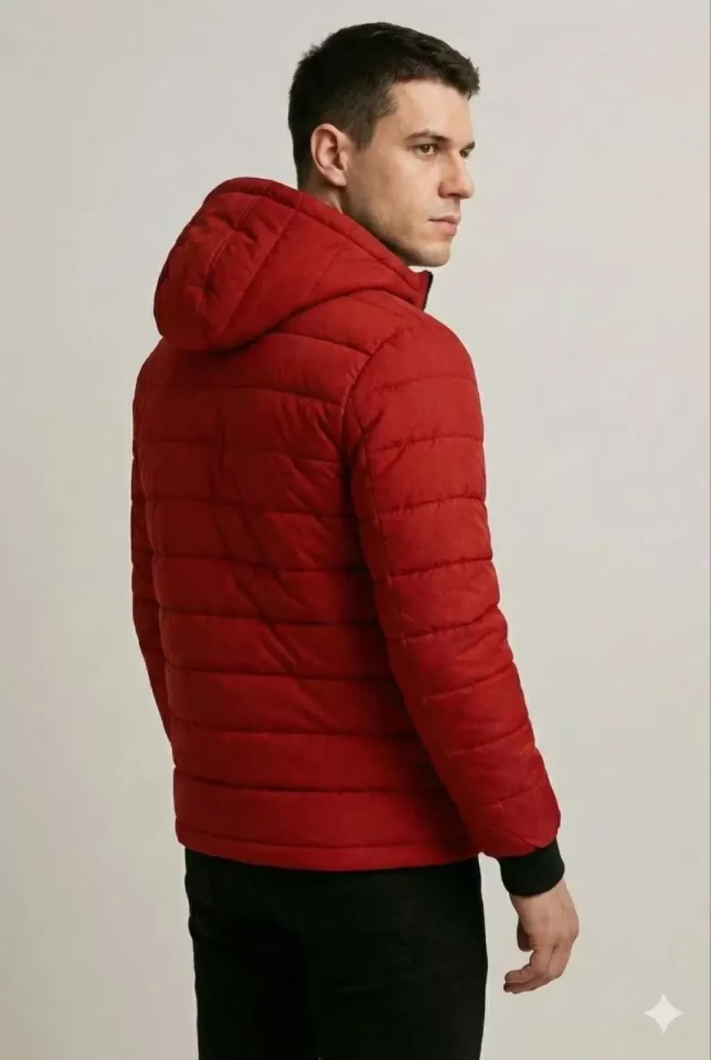 Erkek Şişme Kapüşonlu Fermuarlı Mont Su Itici Kapitone Astarlı Kumaş Cepli Kışlık Rahat Kalıp - Kırmızı