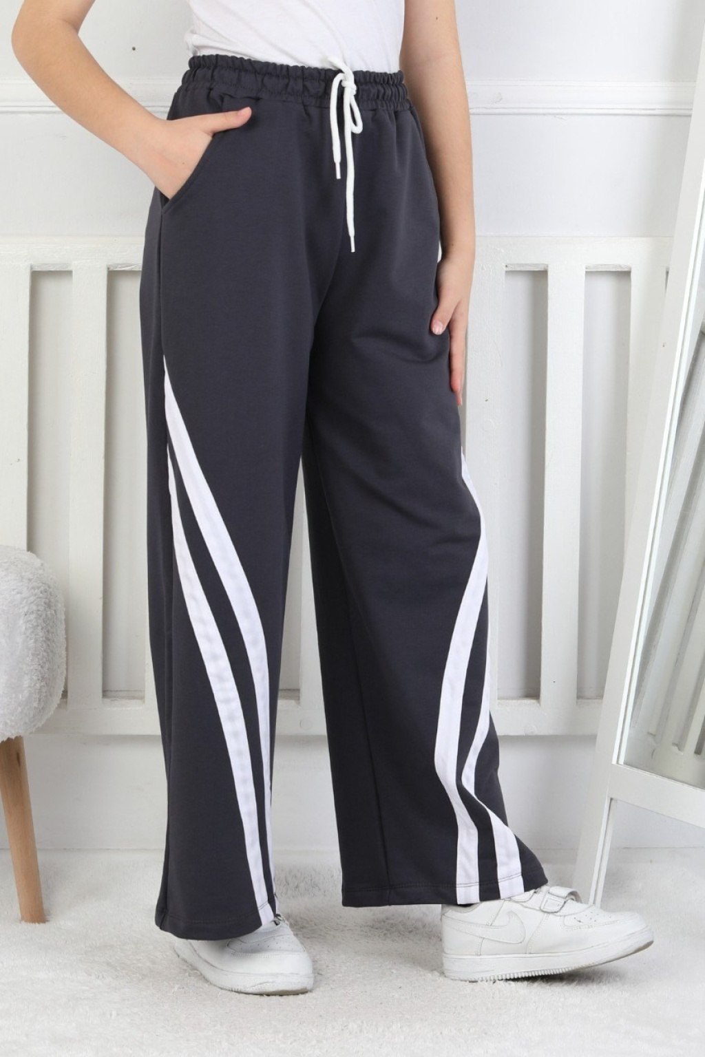 İki İplik Çapraz Çizgili Kız Çocuk Eşofman Altı