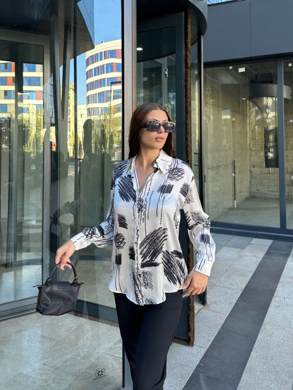 Kadın Uzun Kollu Dijital Baskılı Salaş Saten Gömlek