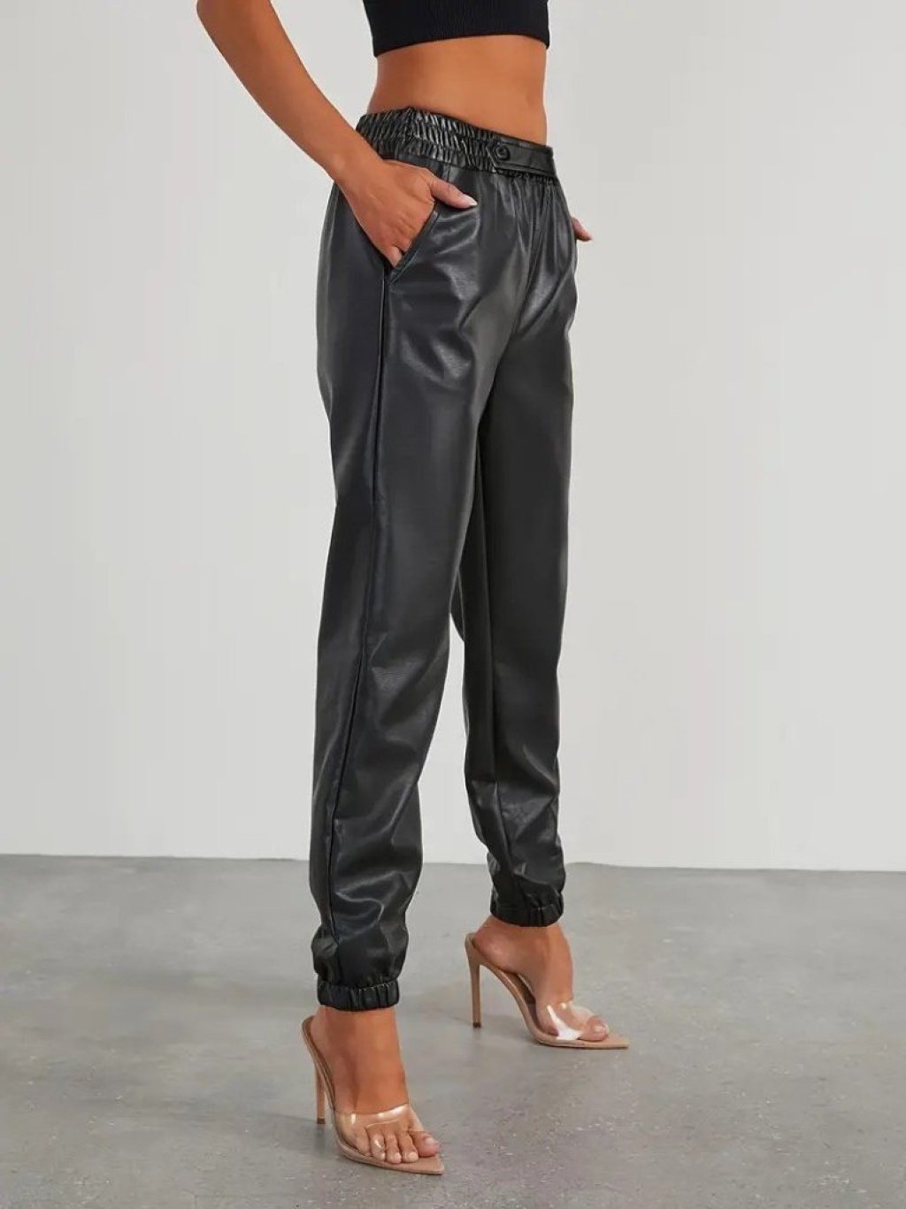 Kadın Yüksek Bel Lastikli önü Düğmeli Deri Pantolon