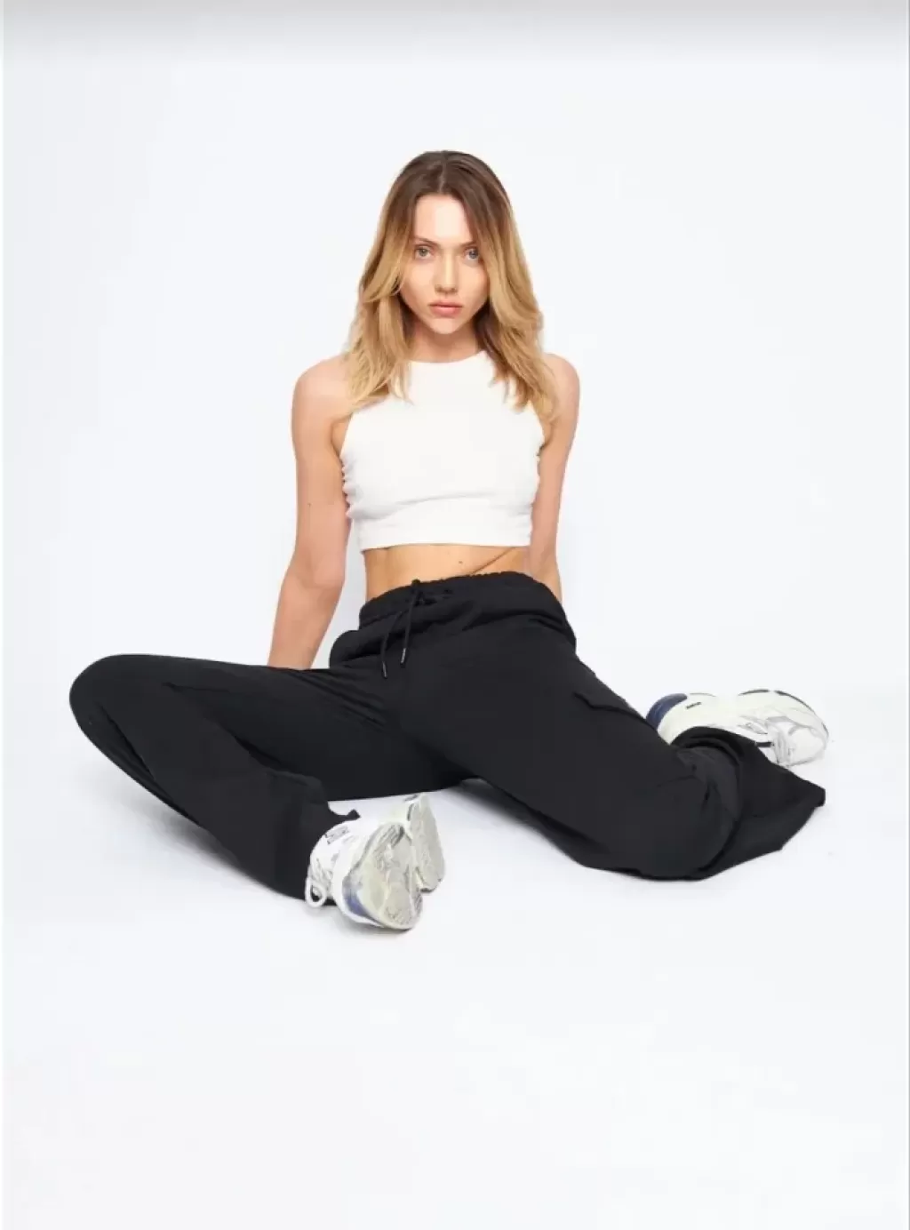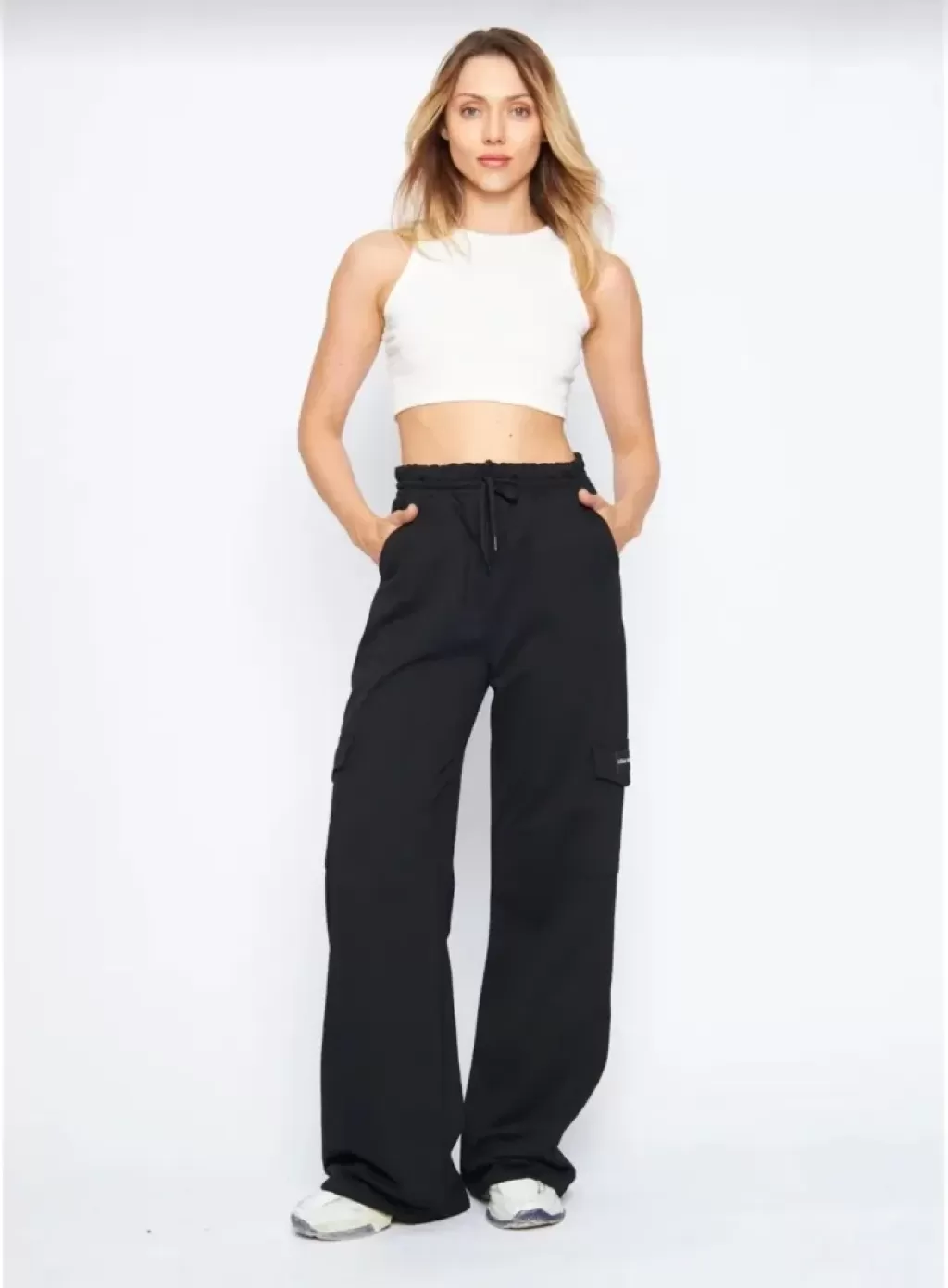 Kargo Cepli Palazzo Oversize Kesim İki Iplik Bol Paça Eşofman Altı Pantalon - Siyah