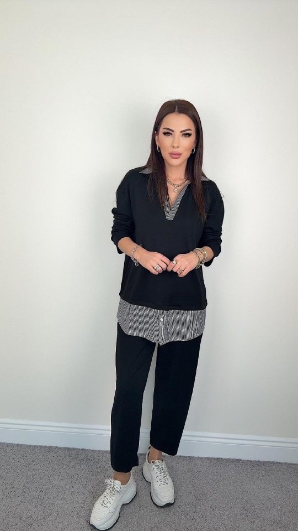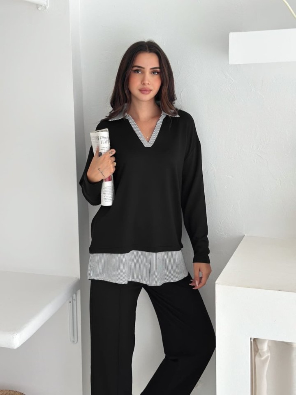 Polo Yaka Gömlek Detay Salaş Balon Pantolunlu ıkılı Takım
