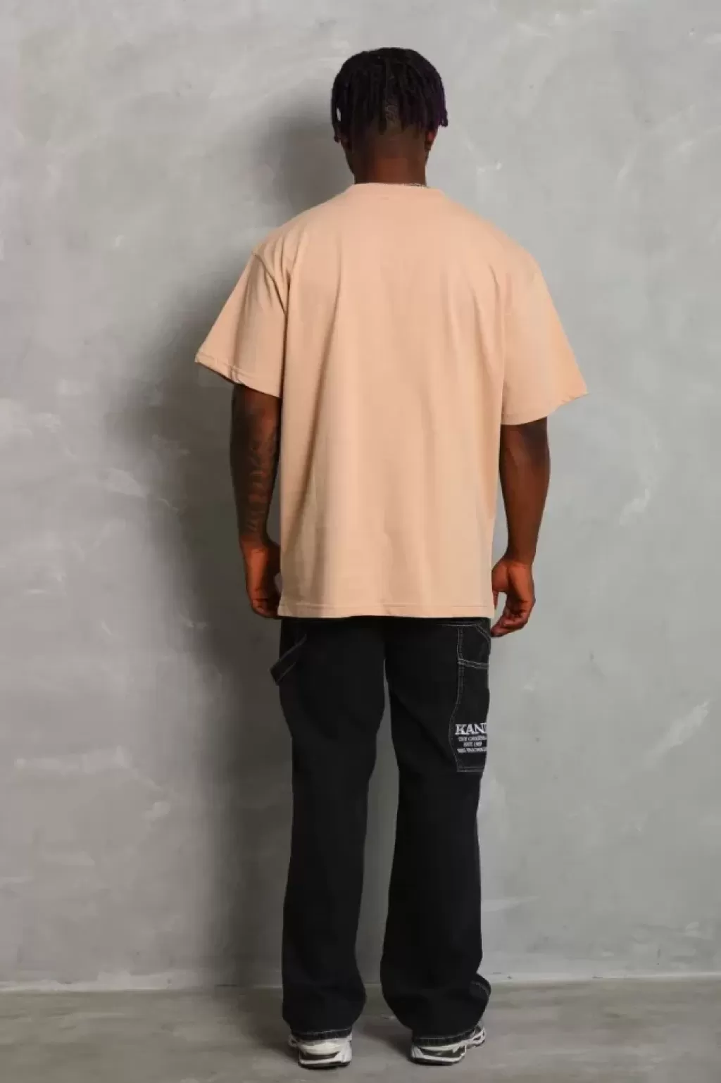 Erkek Asit Yıkama Bisiklet Yaka Kısa Kollu Oversize T-Shirt Tişört - Bej