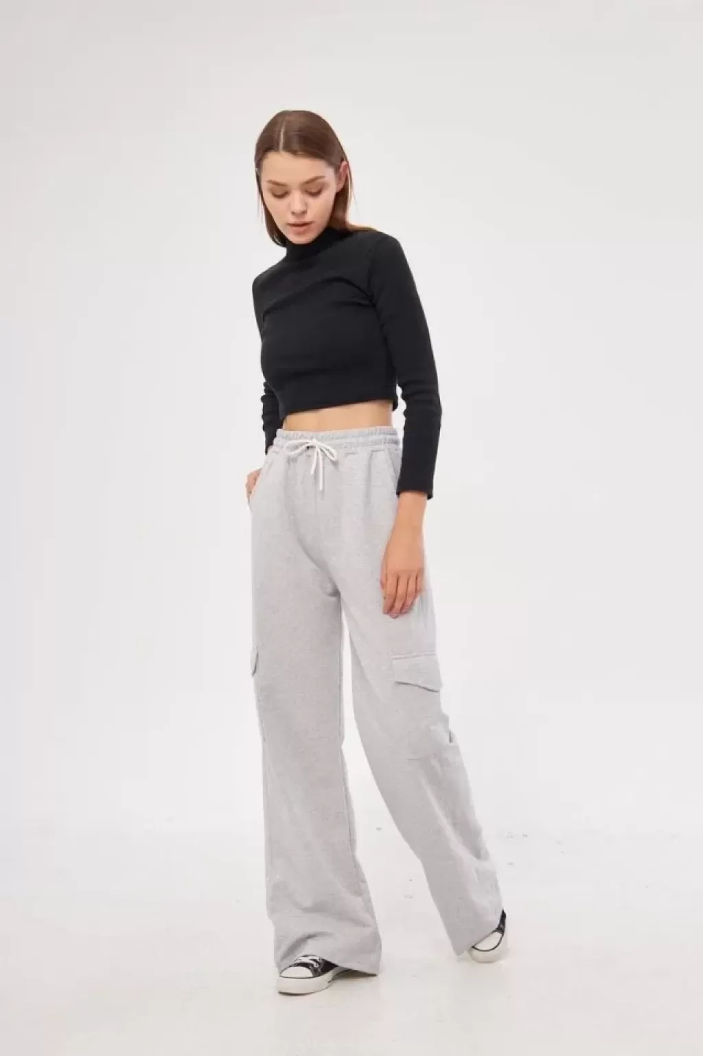 Yüksek Bel Kargo Cepli Palazzo Pantolon Oversize Bol Paça İki İplik Rahat Kesim - Gri